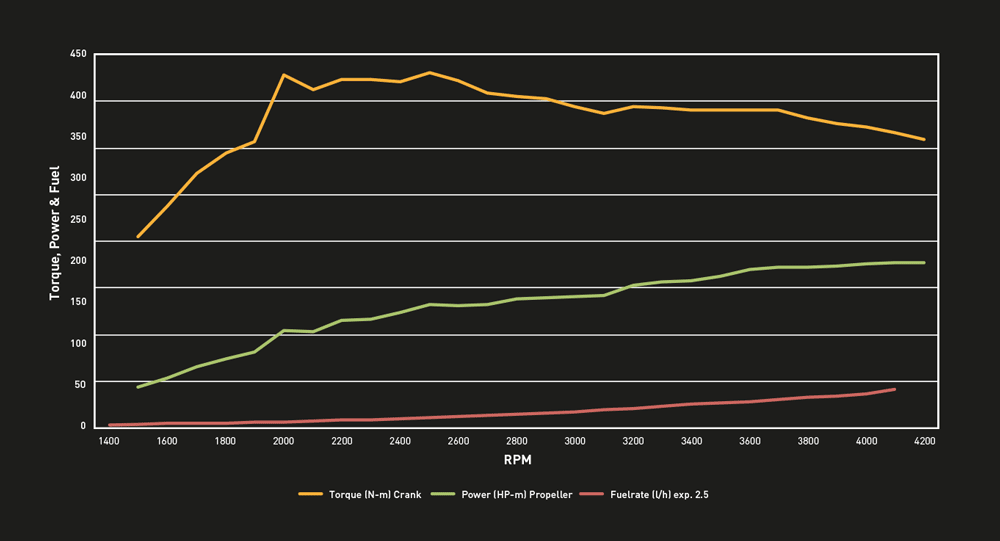 The OXE 175 has been particularly developed with fishing and/or fish-farming in mind. It delivers 175 HP and 380NM (280ft-lb) of torque. With the high torque gear ratio on the primary belt, the unit delivers up