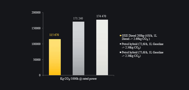 The reduced fuel consumption is a key factor to why the OXE Diesel engine emits significantly lower CO2 than petrol outboard engines. 1L Diesel produces approximately 2.69kg and 1L petrol produces 2.36kg CO2 when ignited. However, as the OXE Diesel consumes up to 42% less fuel than comparable petrol alternatives, the OXE Diesel reduces the CO2 emissions by up to 35.5%.