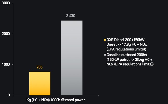 The reduced fuel consumption is a key factor to why the OXE Diesel engine emits significantly lower HC and NOx than petrol outboard engines. 1L of diesel produces approximately 17.8g compared to 1L of petrol which produces 33.4g HC+NOx when ignited.