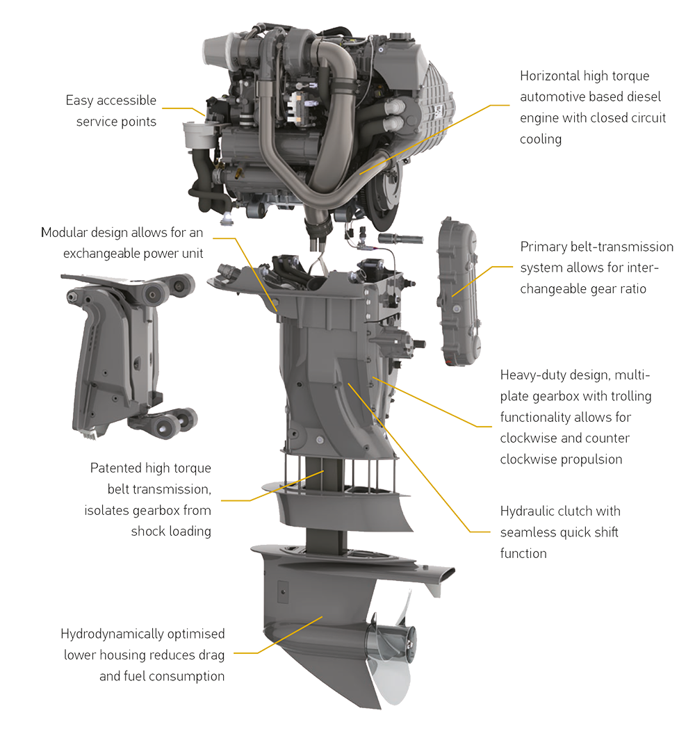 The diesel engine on the OXE Diesel is mounted horizontally; the power is then transferred to the gearbox through a primary belt. From the gearbox output a second belt transfers the power to the propeller shaft.