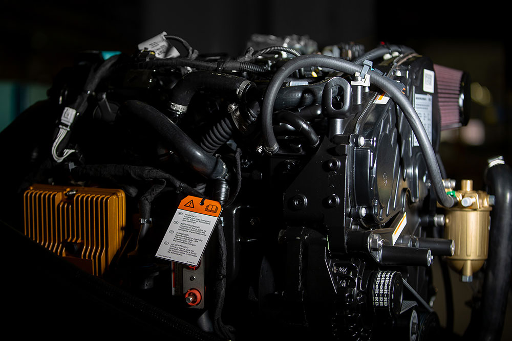 The GM engine has been converted for marine application by using separate systems for seawater, heat exchangers, intercooler and oil cooler and functionality that ensures that the engine, electrical system, fuel system and air intake withstand marine conditions.